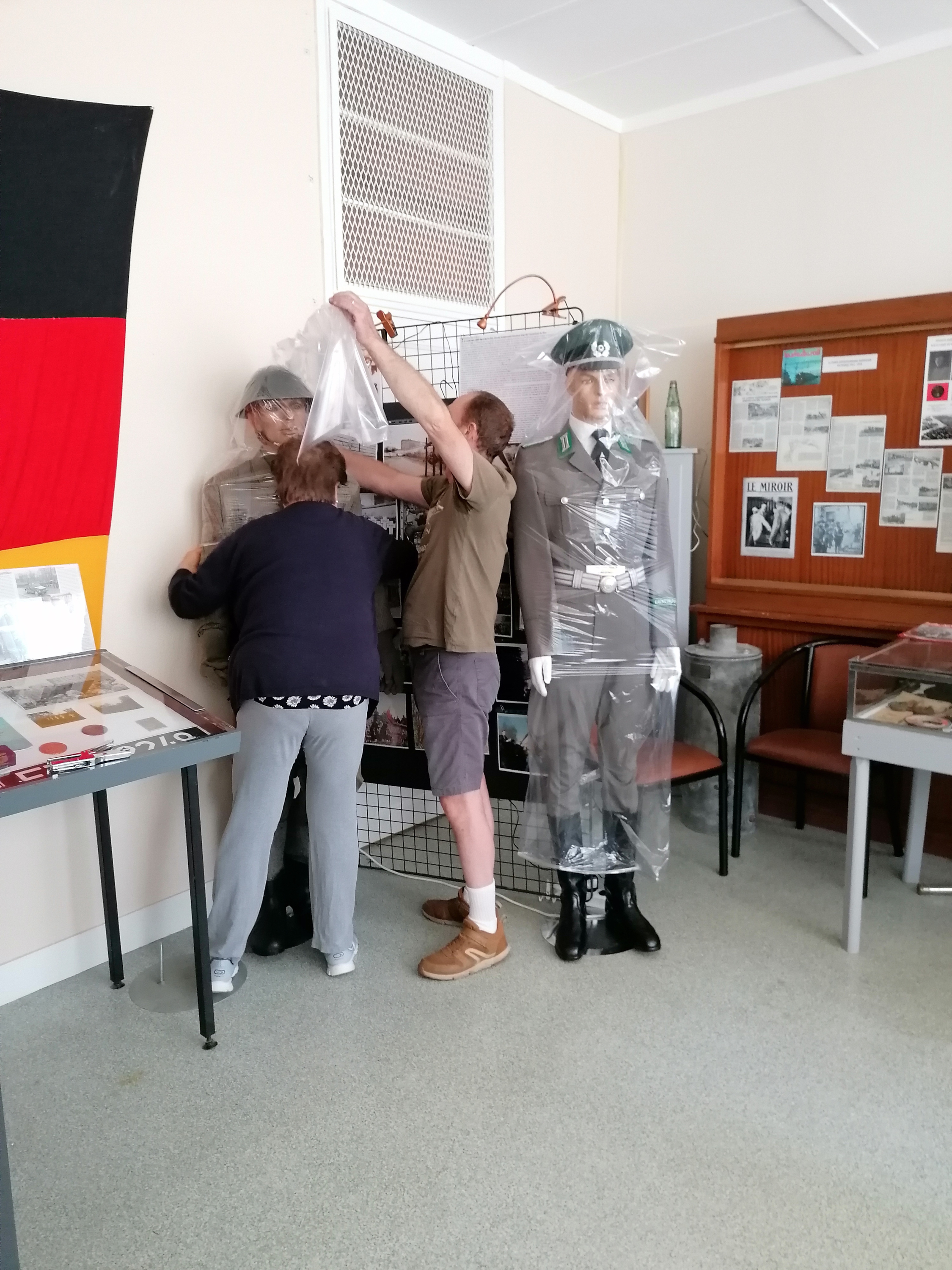 Faced with the threat of new rains, while awaiting the expertise of our insurer and the arrival of the roofer, volunteers from the association have stepped forward to protect our buildings, our rooms, our collections and our uniforms.